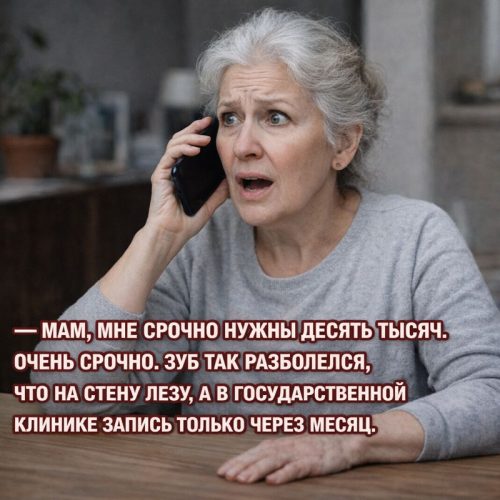 — Мам, мне срочно нужны десять тысяч. Очень срочно. Зуб так разболелся, что на стену лезу, а в государственной клинике запись только через месяц.
