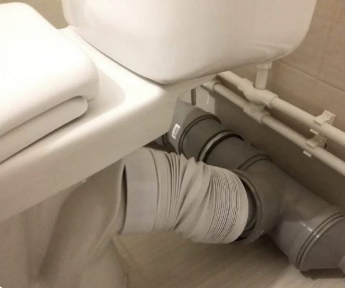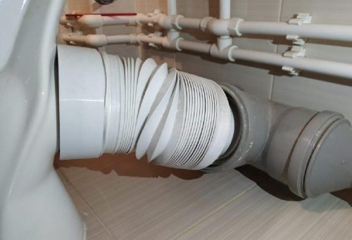 Обычно унитаз подключают к канализационному стояку через гофрированную трубу, позволяющую менять длину и изгиб под нужным углом.