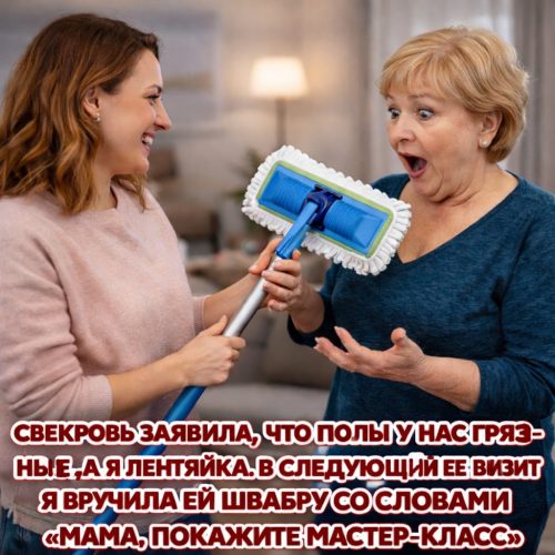 Свекровь отдернула руки от швабры, как от раскалённого железа. — Убери немедленно, — буркнула она, усаживаясь обратно. — Не паясничай, сама разберёшься.