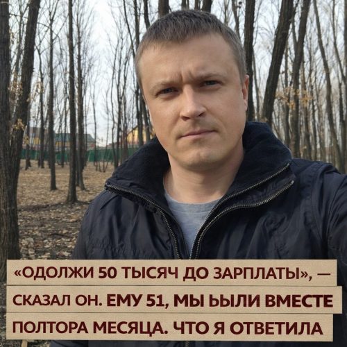 И этот мужчина просил у женщины, с которой он даже не живёт, с которой отношения находятся в конфетно-букетной стадии, 50 тысяч. Не на лечение, не на форс-мажор, а на «бизнес».