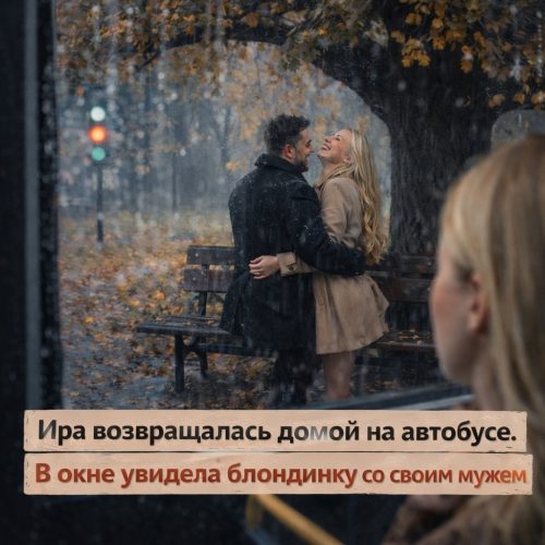 Автобус остановился на светофоре у парка. Ира рассеянно взглянула в окно, и её взгляд случайно упал на пару, укрывшуюся от дождя на скамейке под старым дубом. Мужчина в тёмном пальто обнимал женщину за талию, а она смеялась, запрокинув голову. Блондинка: длинные светлые волосы, яркая помада, короткое пальто, подчёркивающее её фигуру. Ира моргнула, не веря своим глазам. Мужчина повернулся профилем — и её сердце замерло. Это был Сергей. Её Сергей, тот, кто утром целовал её в щёку и обещал приготовить ужин.