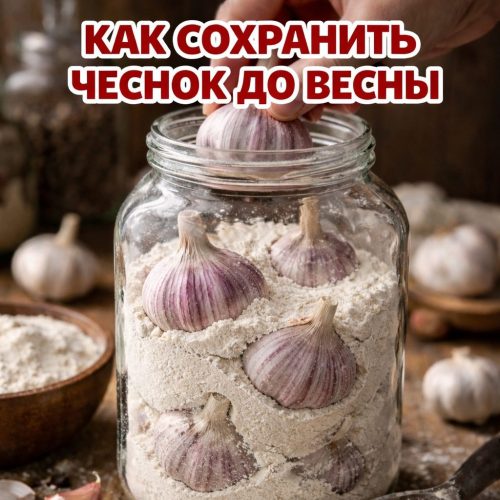Последний, верхний слой хорошо присыпаю мукой, накрываю кастрюлю крышкой и ставлю её на шкаф на кухне, в сухое место. Такой способ позволяет хранить чеснок до весны без потерь, он остаётся свежим и сочным, словно только что собранным с грядки.