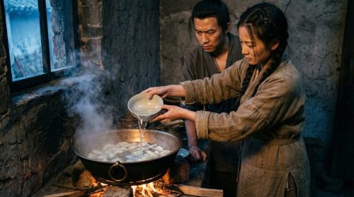 Метод добавления холодной воды назывался «диань шуй» — «точечная вода». На дровах и углях было сложно быстро снизить температуру, вода продолжала кипеть и рвать нежное тесто. Холодная вода работала как термостат, снижая температуру с 100°C до 85–95°C мгновенно. Каркас теста успевал стабилизироваться, а фарш внутри равномерно прогревался.