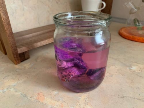 Далее помещаем узелок в банку с тёплой водой, слегка подкрашенной марганцовкой — это помогает обеззаразить семена. Оставляем их на сутки, чтобы они полностью напились влаги.