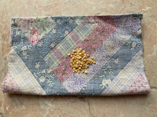 После суточного замачивания узелок слегка отжимаем, заворачиваем плотненько в пакет, а пакет помещаем в небольшое полотенце. Кладём на батарею, подложив что-то тонкое — книгу, журнал или пупырчатую плёнку. Под теплом семена быстро прогреваются и начинают прорастать.