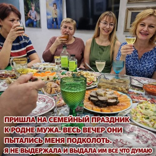 Повод для визита был весомый — юбилей свекрови, шестьдесят лет. Стол ломился от тяжёлых майонезных салатов, холодца и пирогов, а квартира была забита родственниками: тетушки, дяди, сестра мужа Света с мужем и детьми. Едва мы с Димой переступили порог, началась привычная «атакующая» волна комментариев.