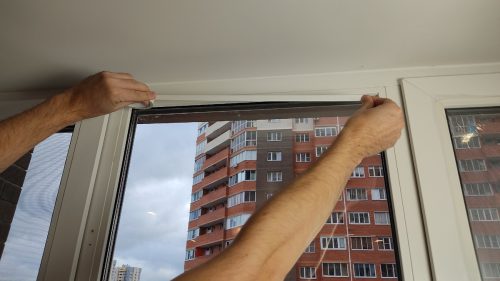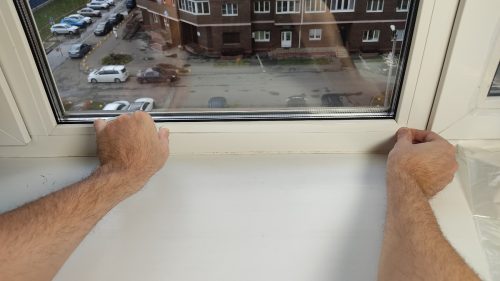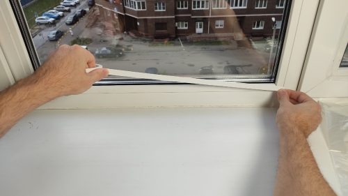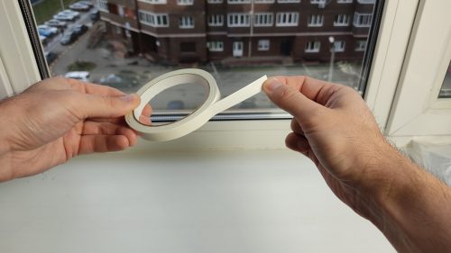 Сначала я наклеил двухсторонний скотч по всему периметру оконной рамы.