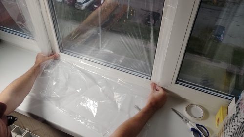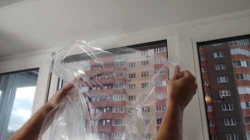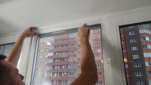 Далее начал крепить плёнку. Прикладывал её сверху и постепенно двигался вниз, фиксируя на скотч.