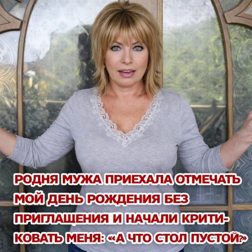 — Как так можно не праздновать день рождения? — с упреком произнесла она. — Гости пришли, а хозяйка даже картошку не почистила! Могла бы хотя бы курицу запечь ради приличия. Муж с работы пришёл, а дома пусто, словно шаром покати.