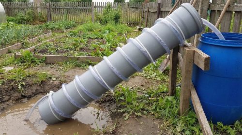 Шланг плотно наматывается на трубу с равномерным шагом около 110 мм. Закрепляется нейлоновыми стяжками через каждые 15–20 см. Нижний конец шланга должен выступать за край трубы на 10–15 см — это зона захвата воды. Верхний выводится в ёмкость или канаву.