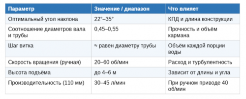 Подъём на большую высоту — не его сильная сторона. При превышении примерно 5 метров производительность заметно падает. А если наклон сделать больше 45 градусов, вода не удерживается в витках и стекает обратно. Для глубины 10–20 метров этот механизм уже не подходит.