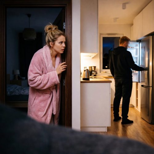 Марина тихо поднялась и подошла к закрытой двери комнаты. За ней слышались шаги. Незваный гость спокойно прошёл на кухню, открыл холодильник и начал что-то доставать. Девушка осторожно приоткрыла дверь, заглянула — и замерла от увиденного.