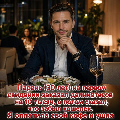 Вживую Марк выглядел как карикатурный образ «успешного успеха»: чёрная водолазка, броский ремень, массивные часы и уверенность, не подкреплённая ничем, кроме слов. Он сразу предложил заказать большое плато морепродуктов «на двоих», но я вежливо отказалась, объяснив, что не голодна. Это явно выбило его из привычного сценария, однако он быстро адаптировался и начал заказывать исключительно для себя — устрицы, тартар, осьминога, дорогое вино.