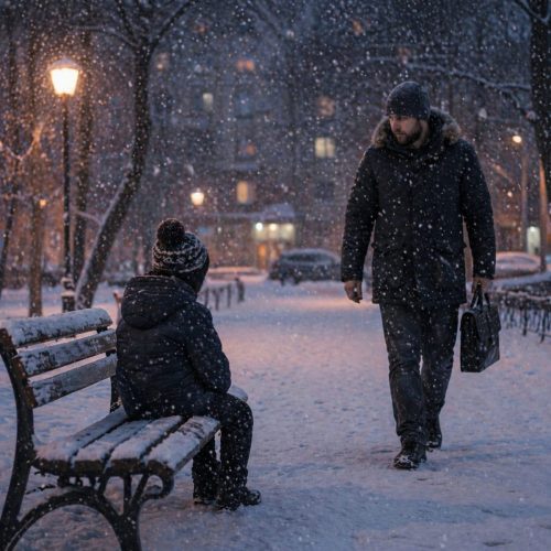 Вдруг его внимание привлёк тихий звук. Он оглянулся и заметил на лавочке мальчика в тёмном пальто и серой шапке. Тот сидел, сгорбившись, и вытирал слёзы с лица. Денис подошёл ближе и мягко спросил: